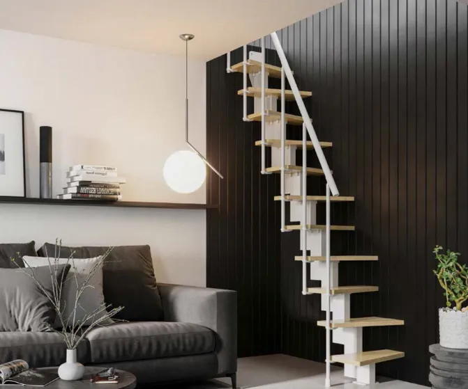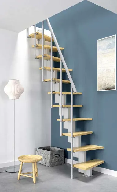 The Small staircase is designed to optimize the available space with a practical and safe solution. The shape of the steps allows the space occupied to be decreased without loosing the comfort of run up the stair.